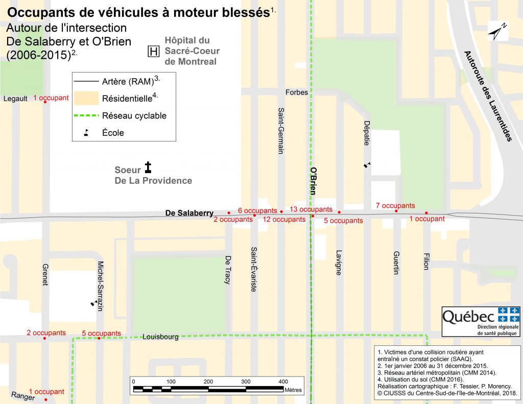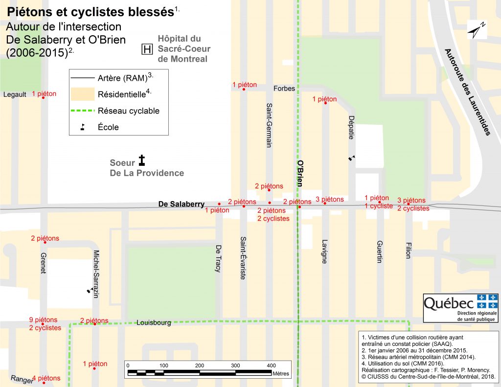 Vérification faite par archive.jdv.symbiodev.xyz, selon une carte de la Direction de la santé publique de Montréal (DSP), on constate qu’il y a plusieurs piétons et cyclistes qui ont été blessés tout au long de la rue de Salaberry, entre 2006 et 2015. (ndlr: voir carte plus bas).