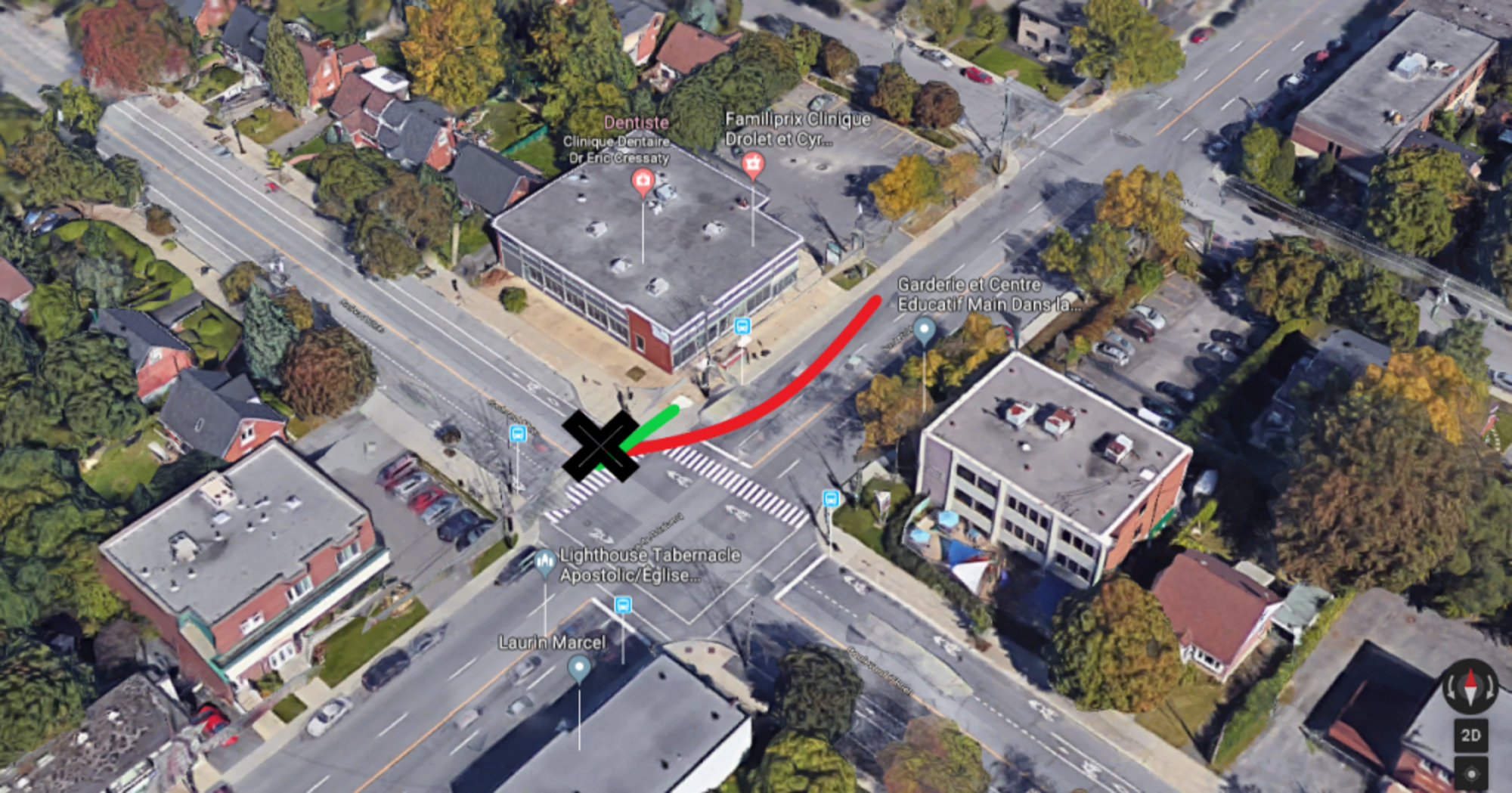 Intersection Salaberry et O’Brien dans Cartierville. En rouge, le trajet du camion et en vert celui de la dame blessée gravement (Photo : Googlemaps, infographie : jdv – Philippe Rachiele)