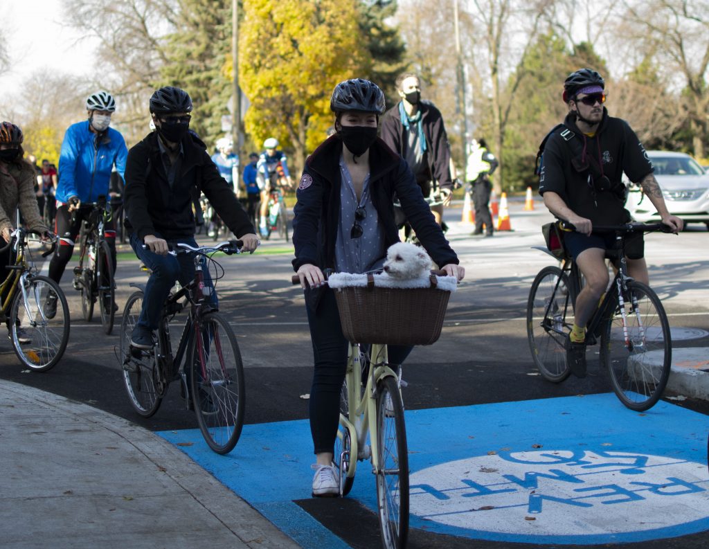 Quelques participants – dont l’une transportant son compagnon à quatre pattes – sur le départ du Réseau Express Vélo (REV) au croisement entre Gouin et Berri (Photo : Carla Geib)