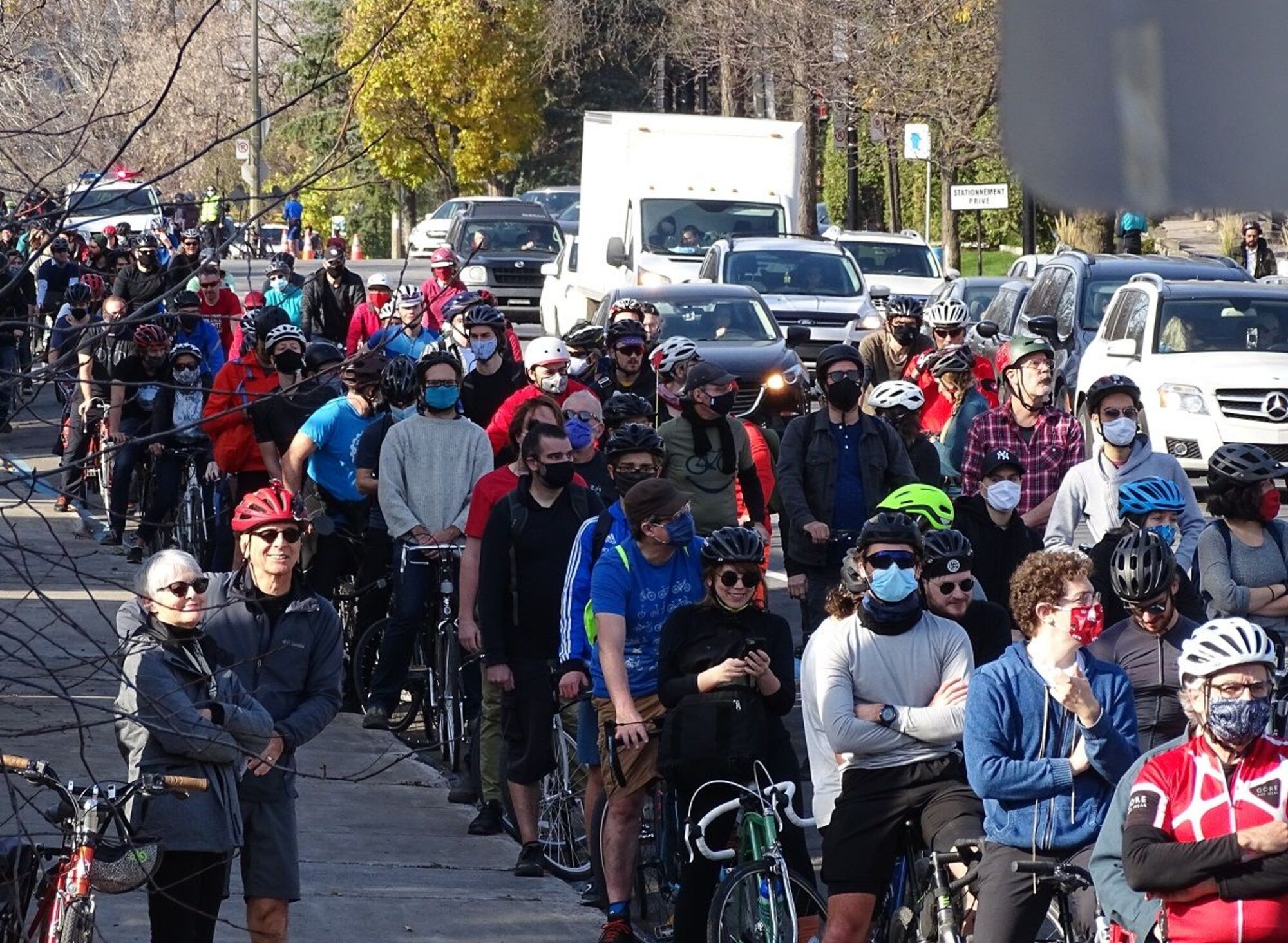 Devant le vélo blanc installé pour souligner le décès de Bernard Carignan sur le Réseau Express Vélo (REV), le jour de l’inauguration citoyenne (Photo : jdv – Philippe Rachiele)