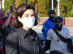 Suzanne Lareau, directrice générale de Vélo Québec sur le Réseau Express Vélo (REV), le jour de l’inauguration citoyenne (Photo : jdv – Philippe Rachiele)