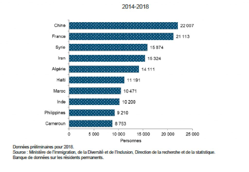 Dix principaux pays de naissance des personnes immigrantes admises au Québec, 2014-2018 (Source : (Source : Recueil de statistiques sur l’immigration au Québec, Ministère de l’Immigration, de la Diversité et de l’Inclusion)