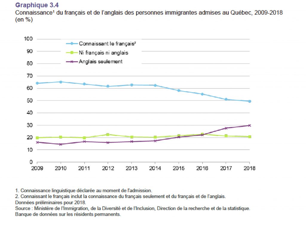 Connaissance du français et de l’anglais des personnes immigrantes admises au Québec entre 2009 et 2018 (Source : Recueil de statistiques sur l’immigration au Québec, Ministère de l’Immigration, de la Diversité et de l’Inclusion)
