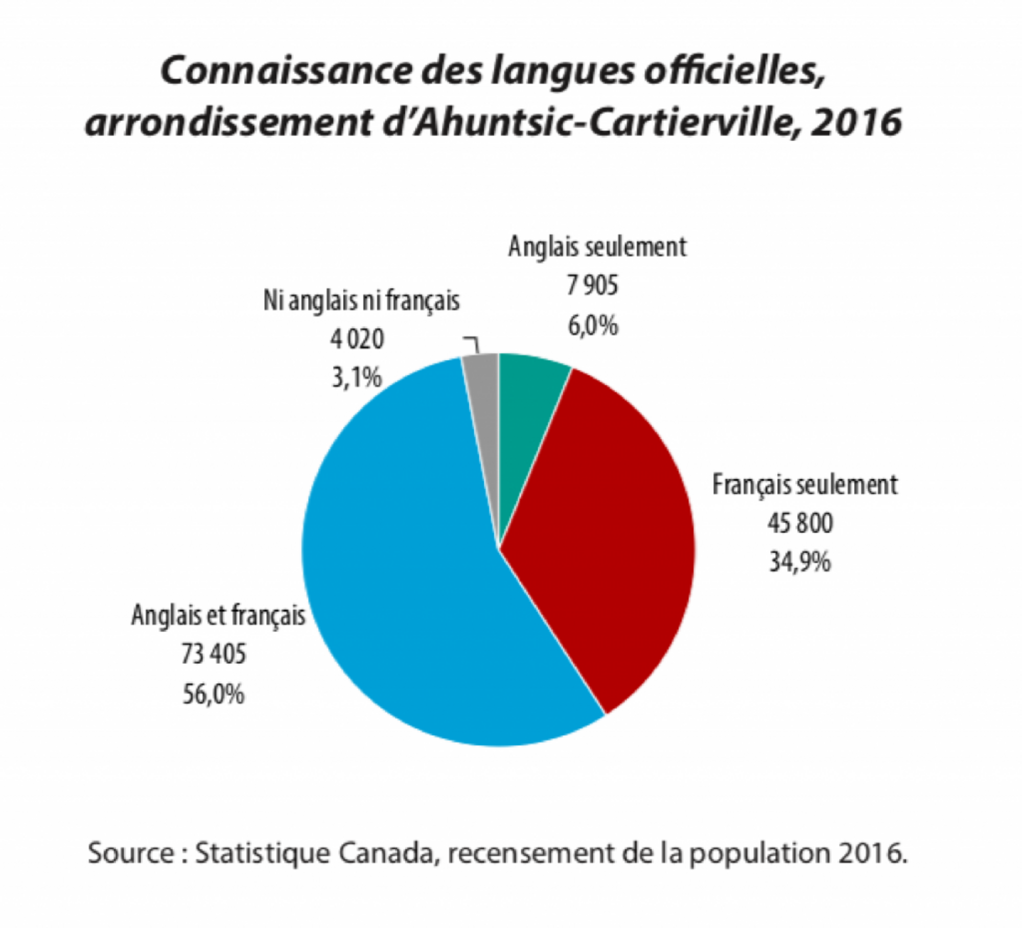 Connaissance des langues officielles dans l’arrondissement d’Ahuntsic-Cartierville, 2016 (Source : Profil sociodémographique de l’arrondissement d’Ahuntsic-Cartierville, édition mai 2018)