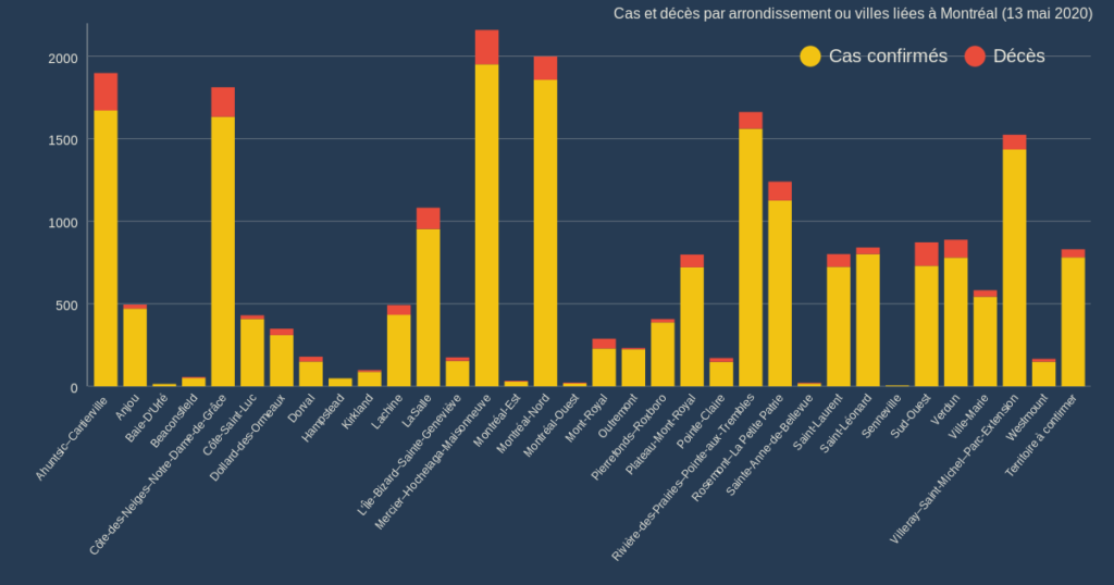 Cas et décès par arrondissement ou villes liées à Montréal (12 mai 2020).