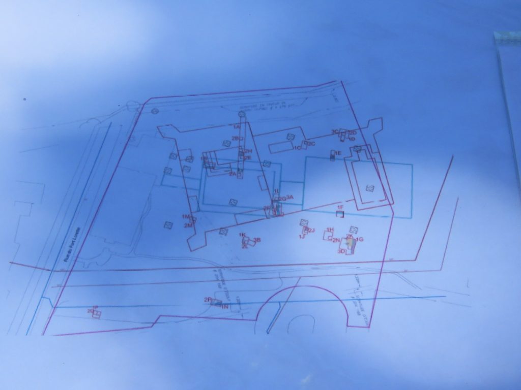 Plan au site du Fort-Lorette projeté (en rouge), selon les découvertes lors des fouilles, superposé sur les bâtiments actuels du site (en bleu).