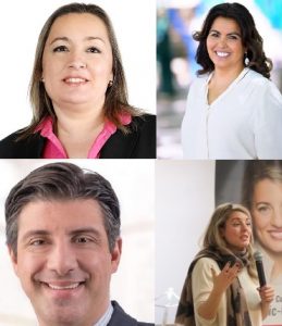 Au 7 juin 2019, les candidats pour l’élections fédérale 2019 qui représentaient leur parti dans la circonscription d’Ahuntsic-Cartierville sont, de gauche à droite, en haut: Kathy Laframboise (PCC); Zahia El-Masri (NPD); de gauche à droite, en bas: Raymond Ayas (PPC); Mélanie Joly (PLC).