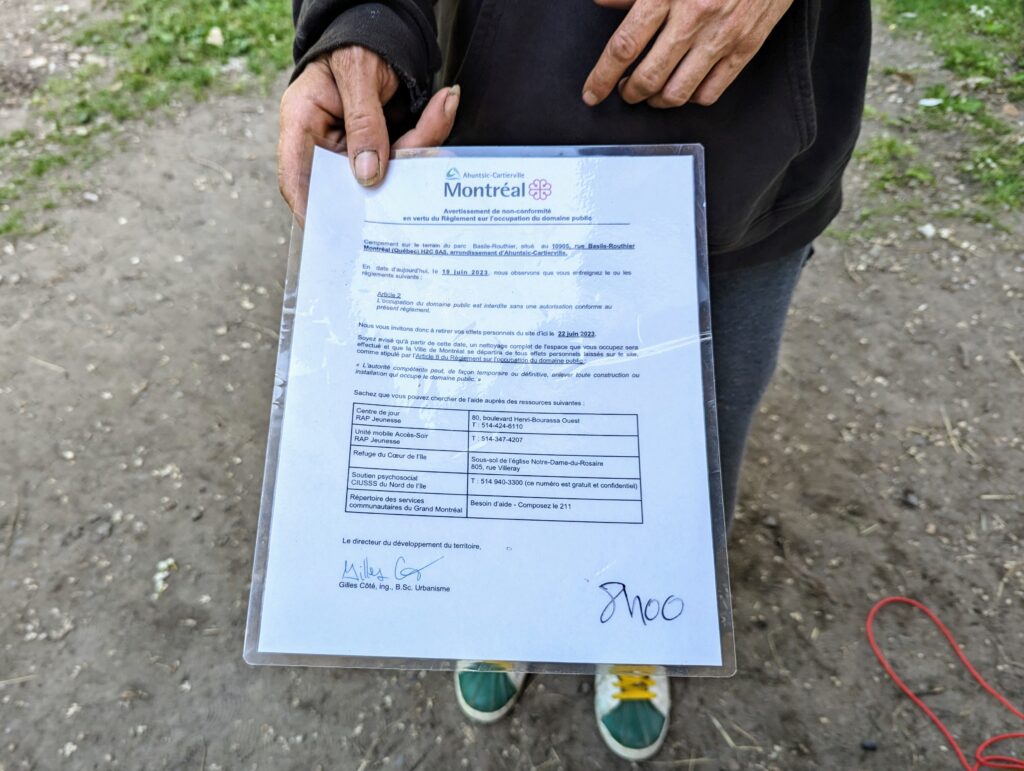 Pourtant, lundi 19 juin un «Avertissement de non-conformité en vertu du règlement sur l’occupation du domaine public» a été remis aux itinérants qui ont planté leurs tentes au parc Basile-Routhier.