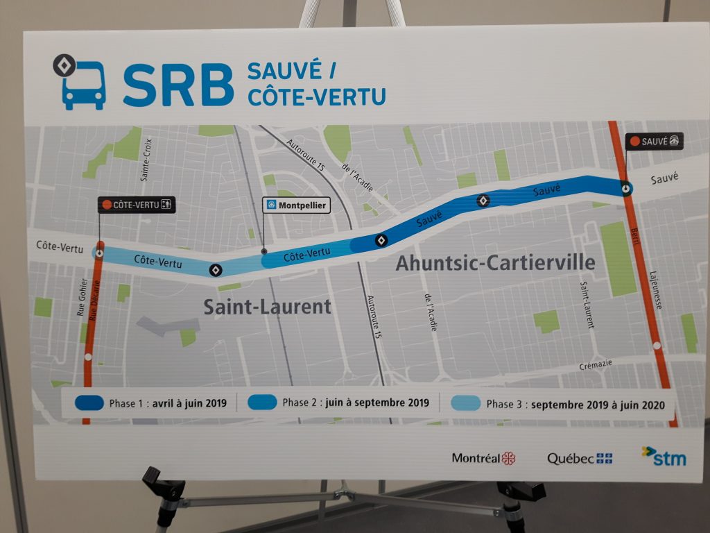 Depuis le 14 décembre dernier, le Service rapide par bus (SRB) Sauvé/Côte-Vertu est désormais en fonction. Il s’agit du premier SRB à Montréal. Avec un trajet d’une longueur de 4,7 km, le SRB emprunte la rue Sauvé et le boulevard Côte-Vertu, entre le boulevard Décarie et la rue Berri. Les autobus qui circulent en totalité ou en partie dans ce corridor bénéficient maintenant de feux prioritaires entre les deux stations de métro et d’une voie réservée en service sept jours sur sept, 24 heures sur 24.
