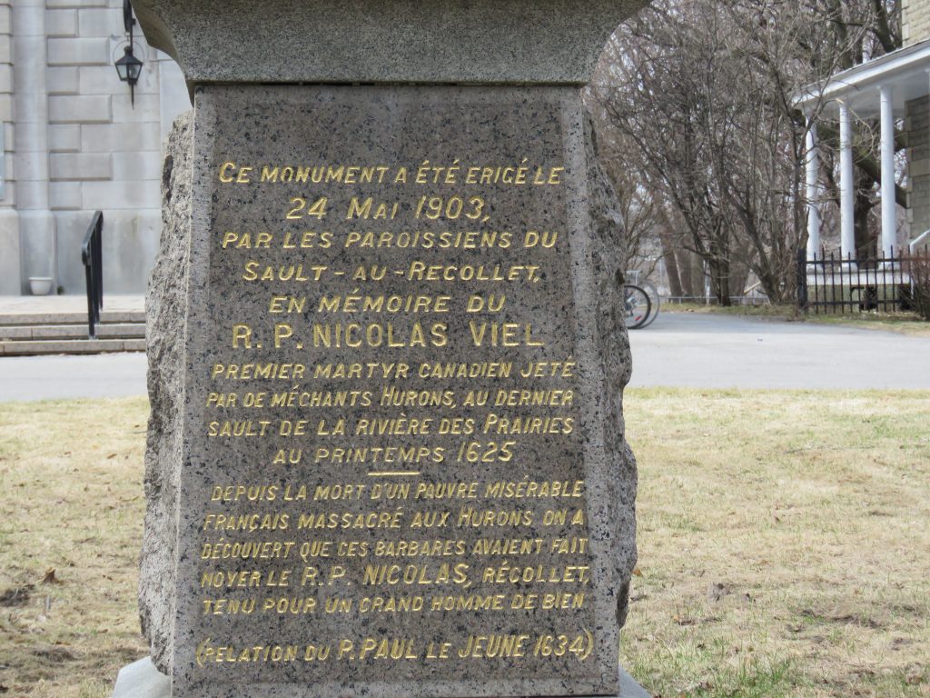 « Premier martyr canadien jeté par de méchants Hurons au dernier Sault de la Rivière-des-Prairies au printemps 1625. Depuis la mort d’un pauvre misérable français massacré aux Hurons on a découvert que ces barbares avaient fait noyer le R.P Nicolas récollet, tenu pour un grand homme de bien. » – Statue de Nicolas Viel