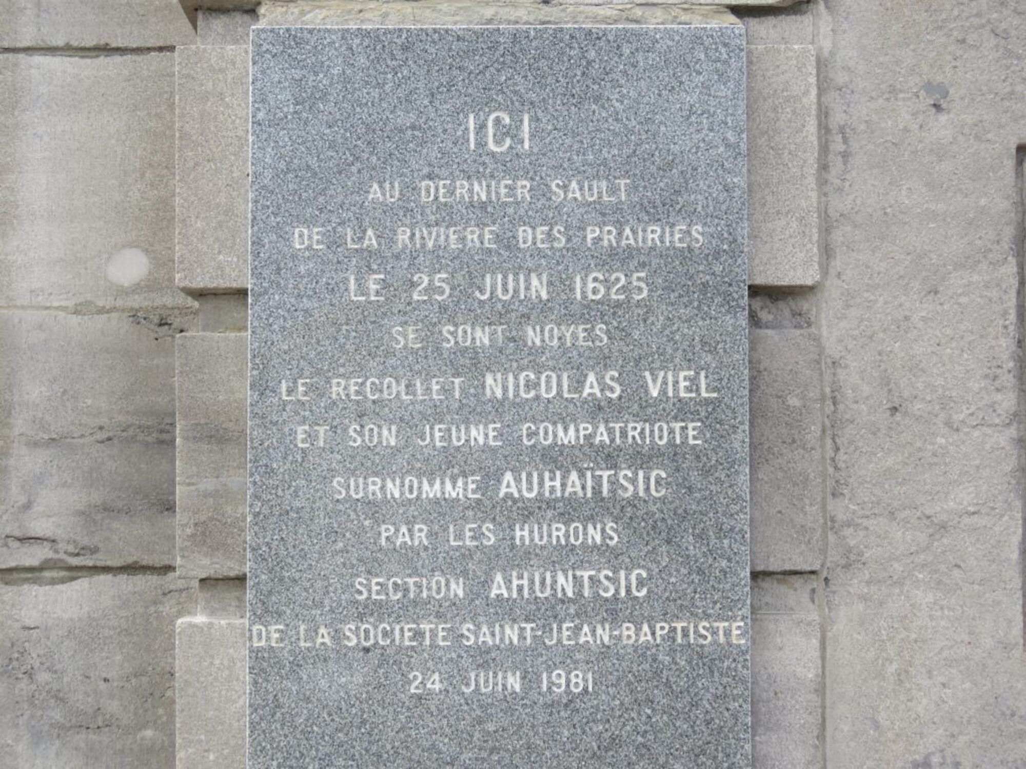 « Ici, au dernier sault de la rivière des Prairies, le 25 juin 1625, se sont noyés le Récollet Nicolas Viel et son jeune compatriote surnommé Auhaïtsic par les Hurons. » — Plaque de la SSJB