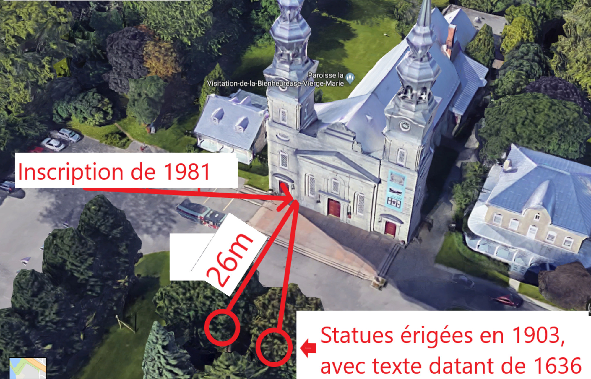 La plaque avec une inscription moins «raciste» est peu visible, car elle est à 26 mètres des statues (Photo : Googlemaps, infographie : Philippe Rachiele)