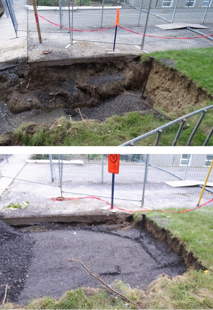 Exemple avant/après du remplissage de gravier en remplacement de la terre sur la rue Clark semblable à certains des travaux sur la rue Olympia (Photos : jdv – Philippe Rachiele)