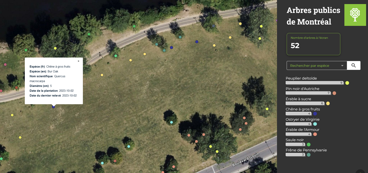 EM : Le site arbres publics est géré par la Ville-centre. Pour nos besoins opérationnels à l’arrondissement, nous utilisons plutôt un [stock] de végétaux informatisé en association avec une plateforme de service cartographique.