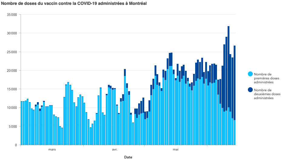 Cette tendance à l’accélération de l’administration des secondes doses est par ailleurs très nette à Montréal, où l’on administre quotidiennement de plus en plus de deuxièmes doses depuis le début de mois de juin.