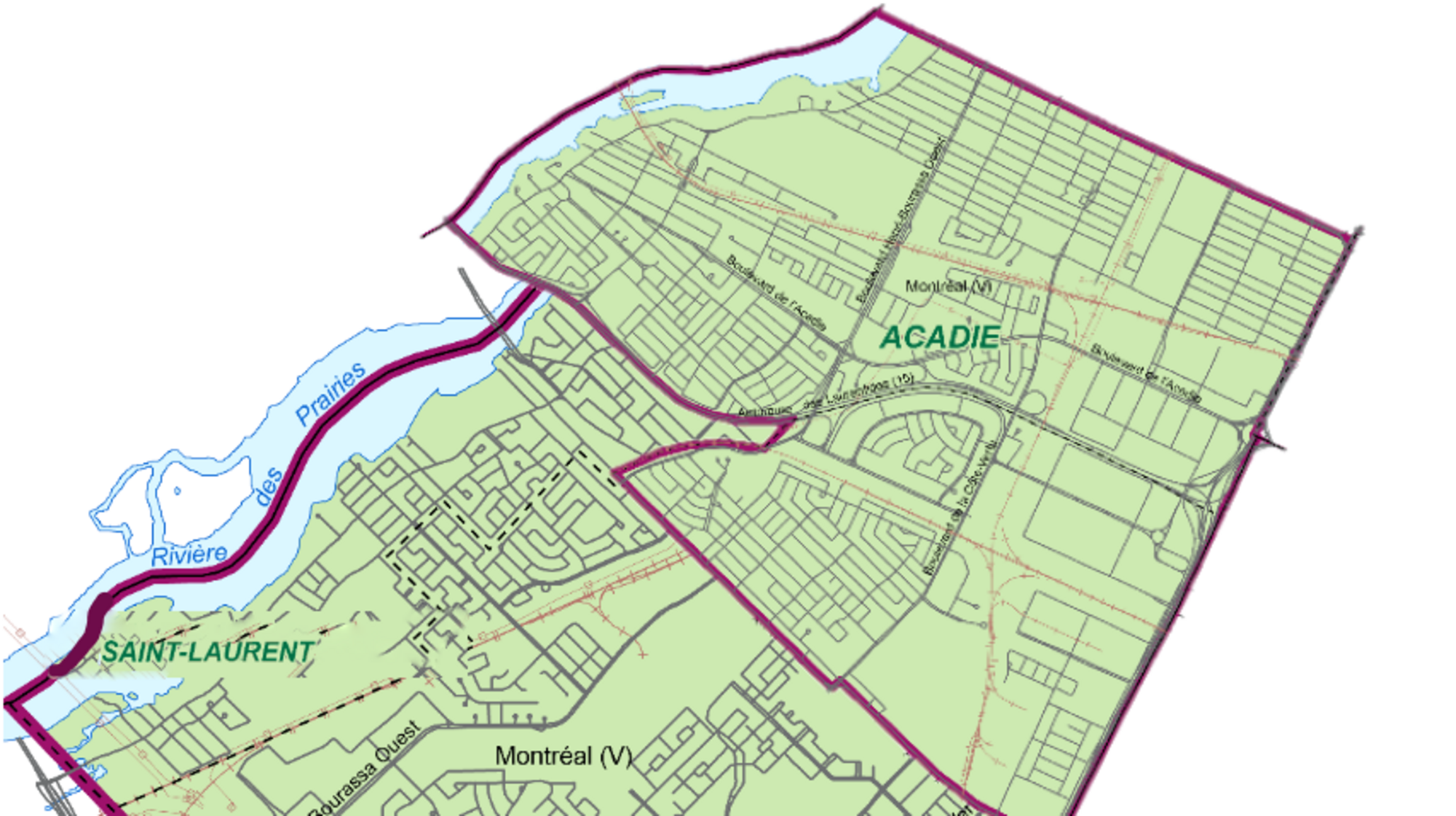 La circonscription de l’Acadie comprend la partie de la Ville de Montréal située dans l’arrondissement d’Ahuntsic-Cartierville et délimitée comme suit : la partie de l’arrondissement d’Ahuntsic-Cartierville située entre l’autoroute des Laurentides (15) et le boulevard Saint-Laurent et le prolongement de ce boulevard.