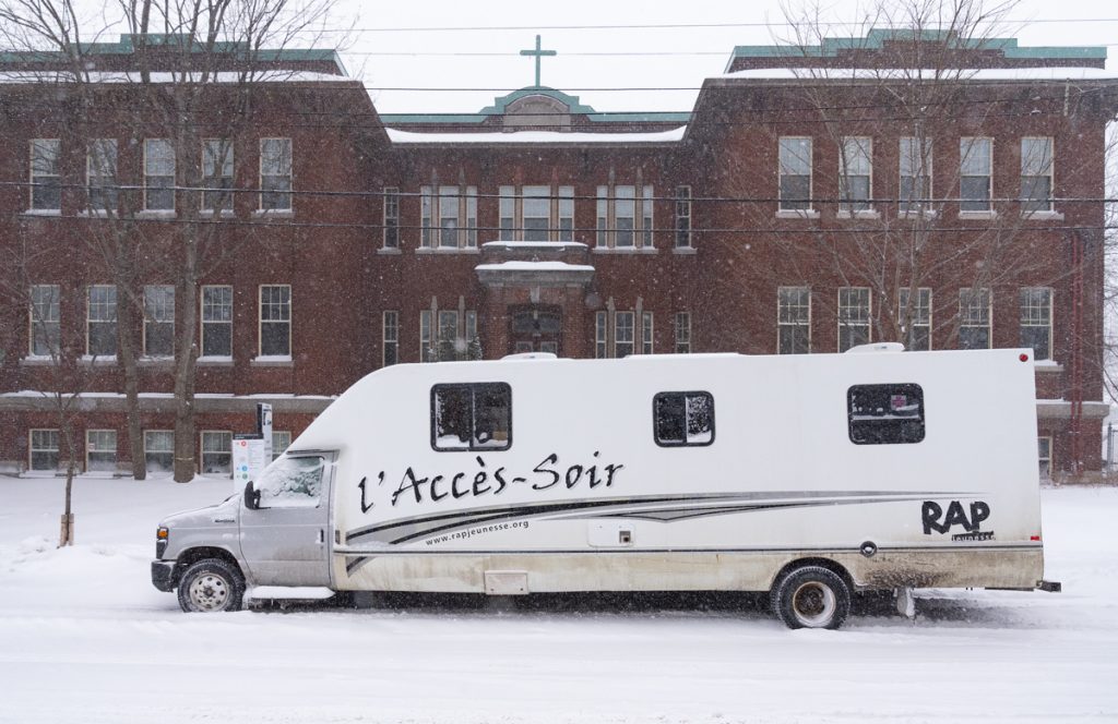 Sous le pont de l’autoroute 40, au croisement de l’avenue Christophe-Colomb et du boulevard Crémazie, le camion de l’Accès-Soir de l’organisme RAP Jeunesse se gare pour son deuxième arrêt de la soirée. Du mardi au vendredi, l’équipe mobile se rend en différents points de rendez-vous de l’arrondissement. Objectif: rejoindre les gens les plus précaires, briser l’isolement, faire de la prévention. Chaque soir, ils reçoivent 20 personnes en moyenne.