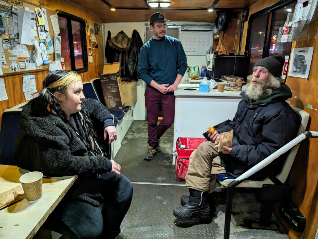 Pendant une heure, Véro, Rachel et Gabriel lui apportent ce qui lui manque le plus: la chaleur humaine. Autour d’un café bien chaud, ils prennent de ses nouvelles, discutent de tout et de rien comme on le ferait avec un ami. Rejoints par un autre homme en situation d’itinérance, les professionnels l’accueillent avec un sourire et un café.