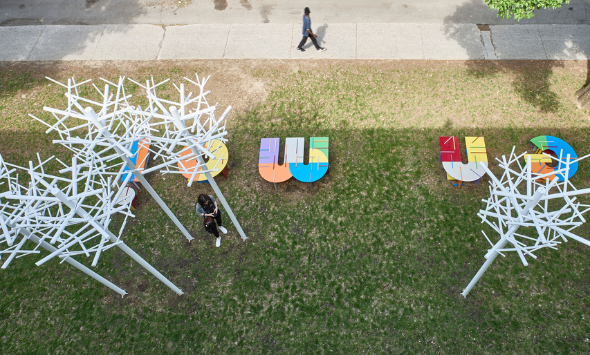 Une œuvre d’art sur la façade du bâtiment annonce avec 10 bancs-lettres colorés Crois en moi. Cette sculpture de l’artiste Michel Goulet intitulée Aujourd’hui pour demain marque ce renouveau.