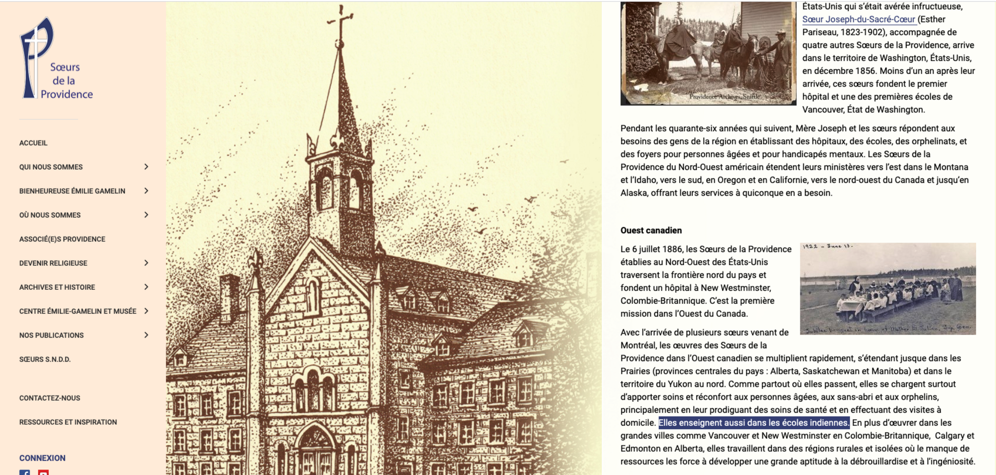 Outre un bref passage dans l’historique de la congrégation, où l’on note que les sœurs qui se sont établies dans l’Ouest canadien à la fin du 19e siècle « enseignent aussi dans les écoles indiennes », on ne trouve aucune référence directe à l’implication des Sœurs de la Providence dans la création et la gestion d’écoles résidentielles autochtones.