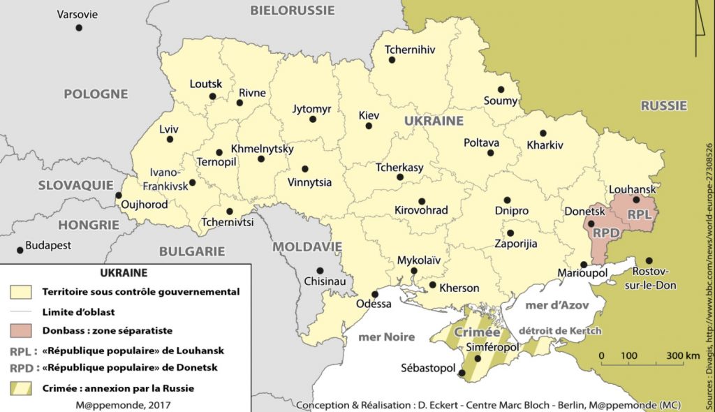 En 2014, l’UE a signé un accord d’association économique avec l’Ukraine, tout en appuyant la « révolution de Maidan » dans ce pays, qui visait à déloger du pouvoir le président Yanukovych, allié de Moscou. La Russie a riposté à ce qu’elle a qualifié « de coup d’état » par l’annexion de la Crimée et  un soutien aux prétentions autonomistes des républiques de Donesk et de Lougansk, dans l’est de l’Ukraine, où résident des populations russophones qui prétendent être négligées par le gouvernement de Kiev.