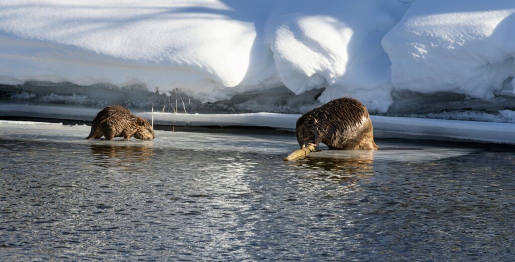 Un petit castor de l’année accompagné par un plus vieux en hiver. Photo :Carol / Gray/ Shutterstock 2276508239