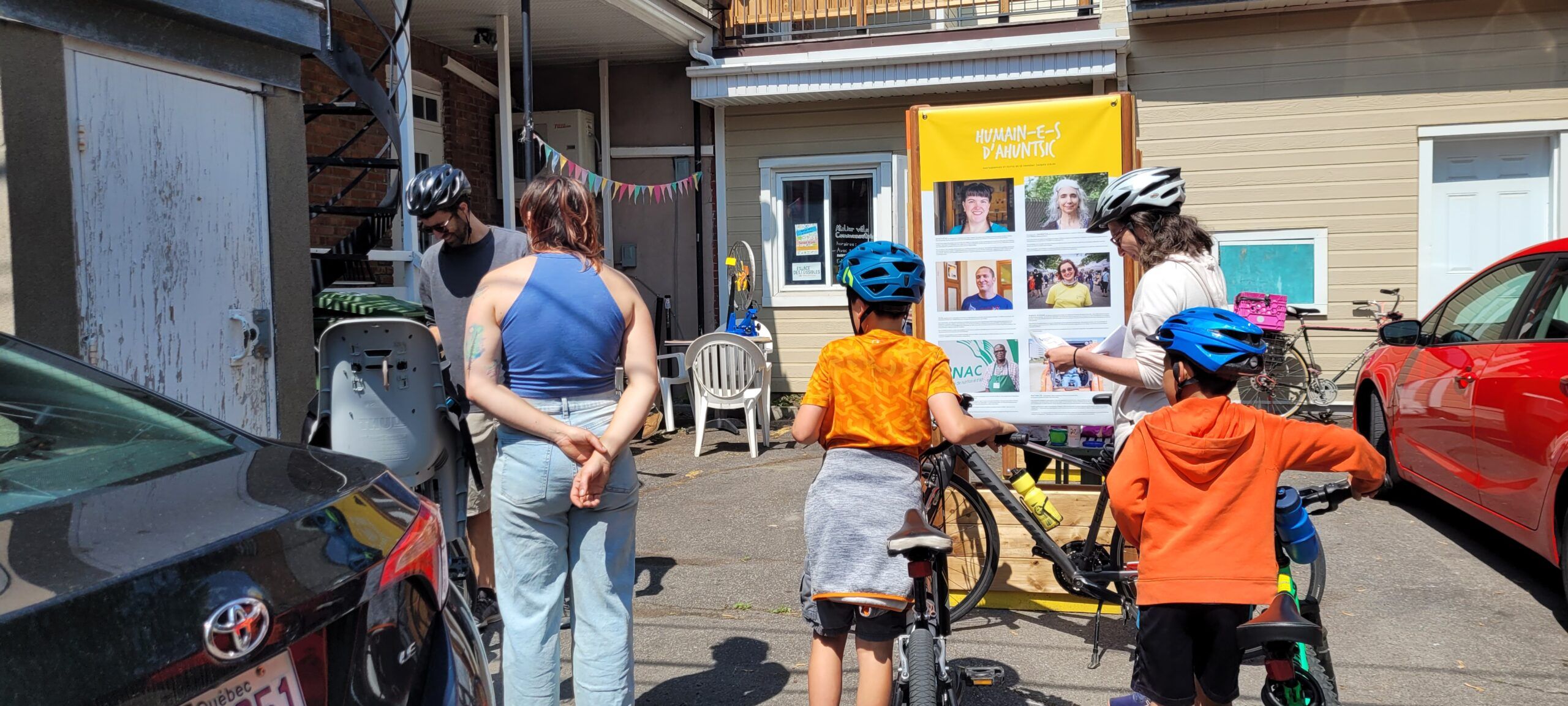 Le trajet, entièrement prévu sur les pistes d’Ahuntsic-Cartierville, amenait ensuite les cyclistes (majoritairement des familles avec des enfants de tous âges), vers l’étape 2, où les attendaient les résidents de la Ruelle des 400 Coups! Les participants devaient résoudre des charades, en se promenant dans la ruelle.