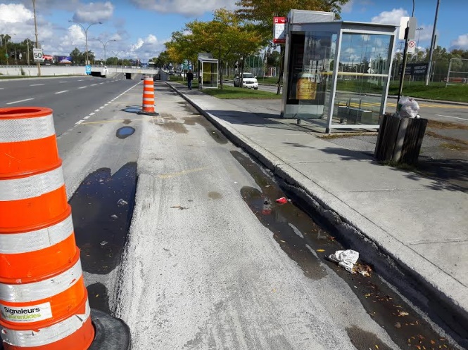 En juillet 2016, archive.jdv.symbiodev.xyz avait constaté qu’à quelques arrêts de bus, notamment, l’asphalte s’était affaissé à cause, entre autres choses, de la chaleur, créant ainsi des ornières sur la route. La Ville avait fait ses devoirs et plusieurs de ces ornières, notamment à l’arrêt de bus sud direction est sur le boulevard Henri-Bourassa Ouest, devant le cégep Bois-de-Boulogne, semblaient avoir été réparées en partie avec du béton, et en partie avec de l’asphalte.