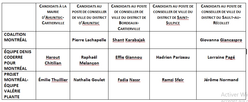 LISTE DES CANDIDATS – ÉLECTIONS MUNICIPALES DANS AHUNTSIC-CARTIERVILLE