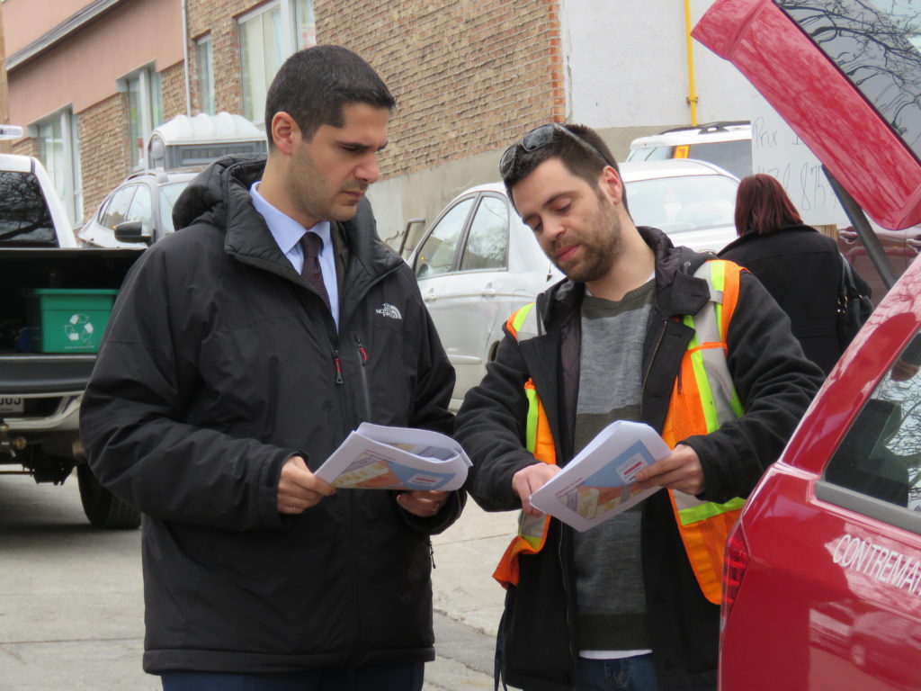 Harout Chitilian, conseiller du district de Bordeaux-Cartierville en discussion avec un contremaître de la Ville. (Photo : jdv – Philippe Rachiele, 2017-05-10)
