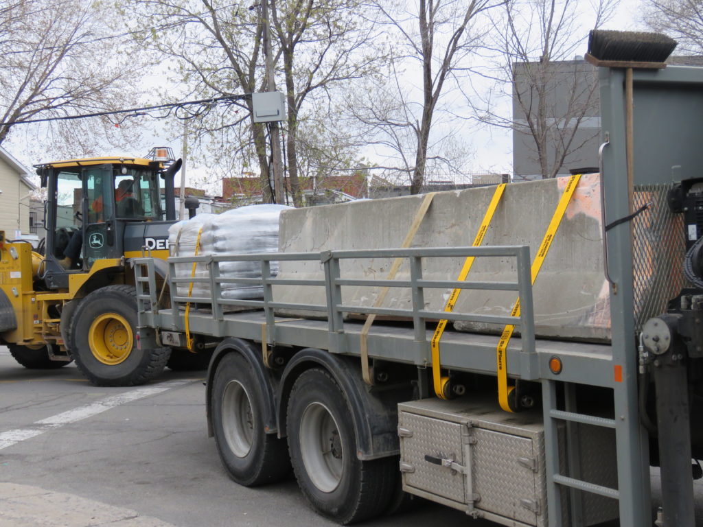 Des sacs de sable et muret qui arrivent rue Cousineau pour aider à bloquer l’eau qui passe par le club de canotage de Cartierville. (Photo : jdv – Philippe Rachiele, 2017-05-10)