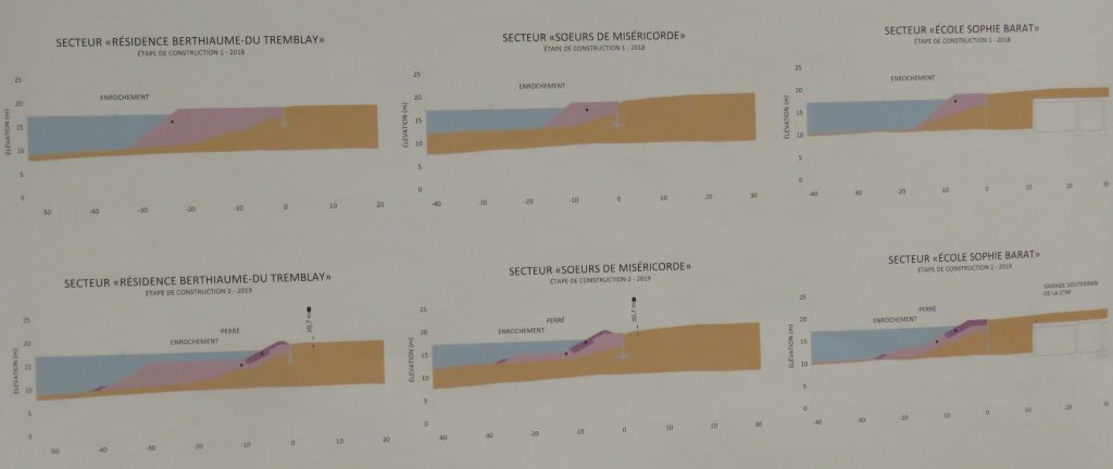 Selon Hydro-Québec, la première série de travaux d’enrochement à l’arrière de l’école Sophie-Barat, de la résidence Berthiaume-du-Tremblay, et de l’ancien terrain des Sœurs de Miséricorde devrait se terminer en décembre.  La partie supérieure du document ci-dessus fourni par Hydro-Québec indique l’enrochement (en rose) effectué en 2018, alors que la partie inférieure indique le résultat que les riverains pourront constater une fois les travaux terminés en 2019.