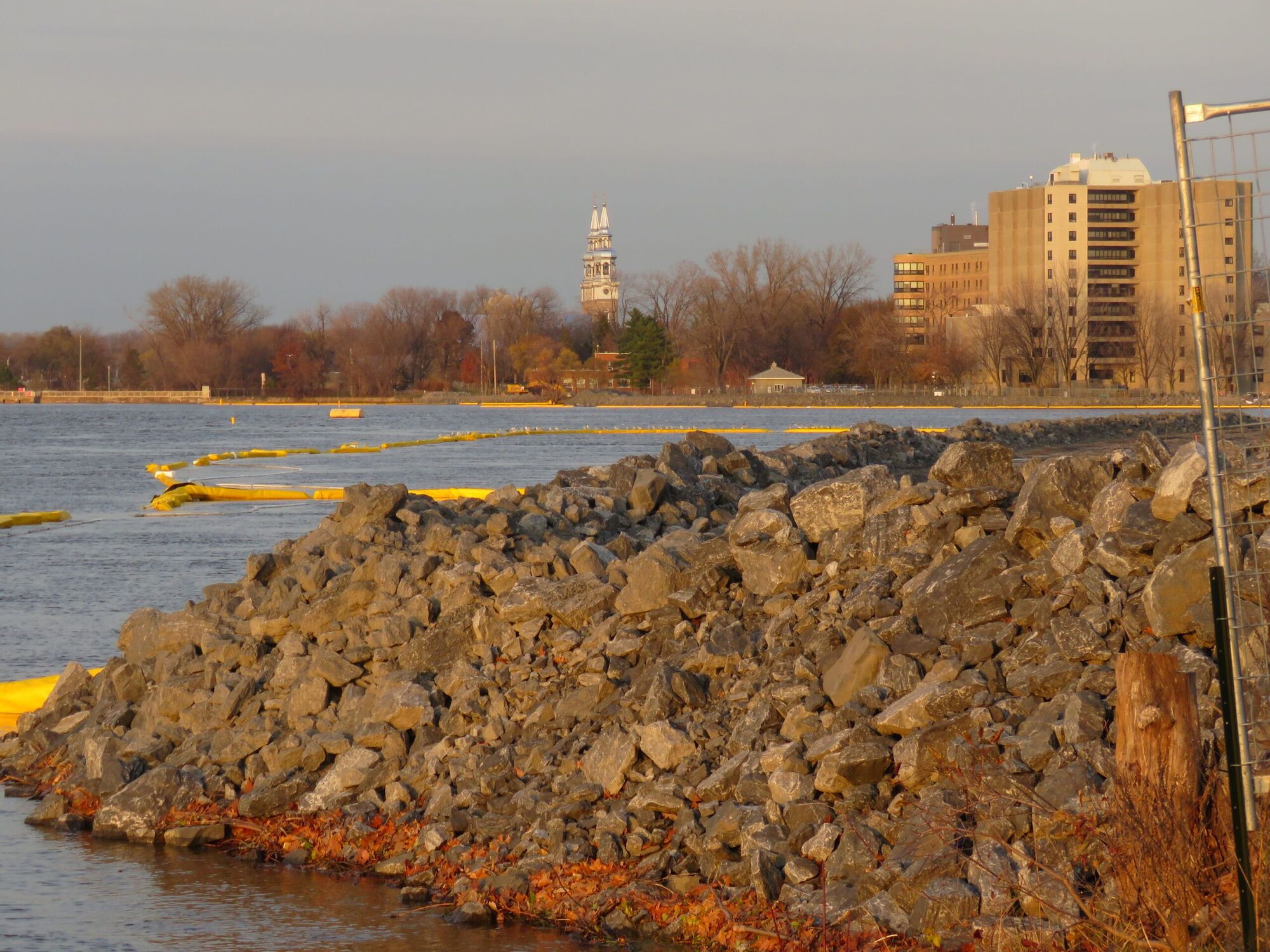 Photo de l’enrochement à l’arrière de l’école Sophie-Barat avec vue sur la résidence Berthiaume-du-Tremblay, l’ancien terrain des soeurs de la Miséricorde et l’église de la Visitation le 12 novembre 2018 (Photo : jdv – Philippe Rachiele)