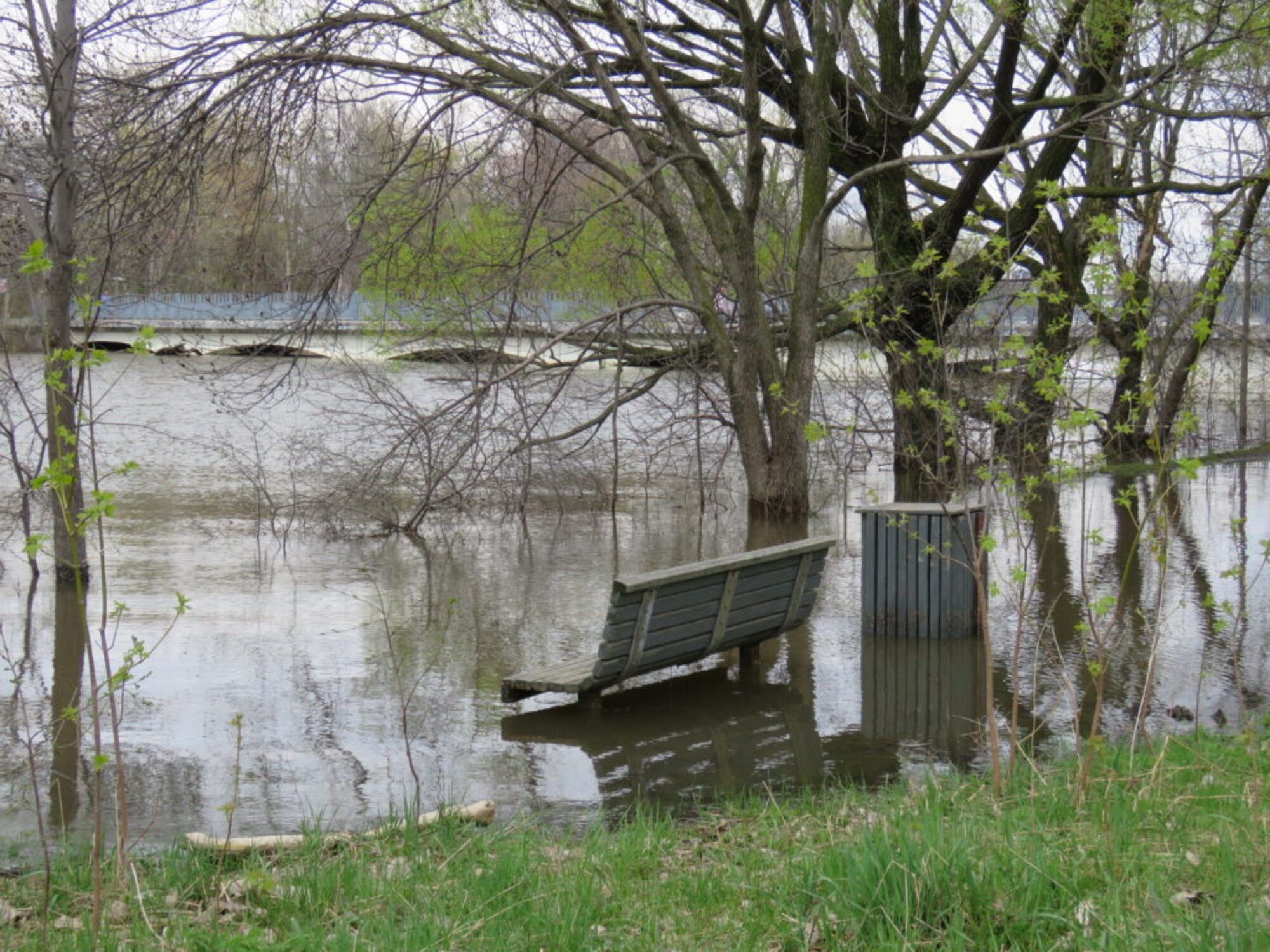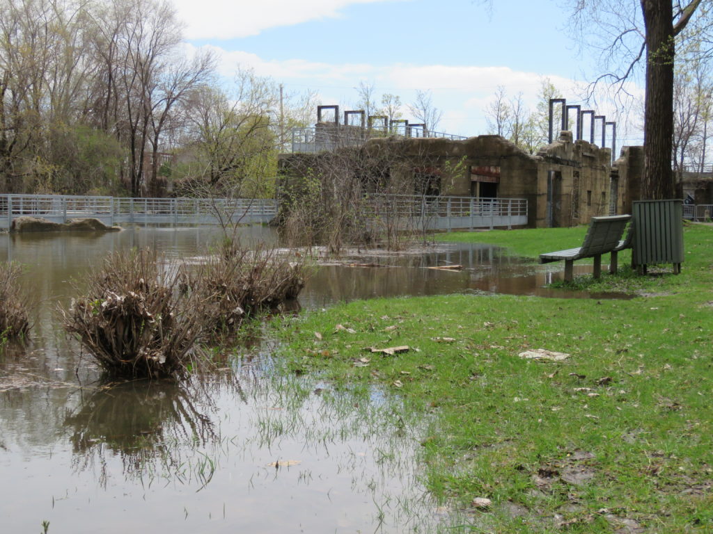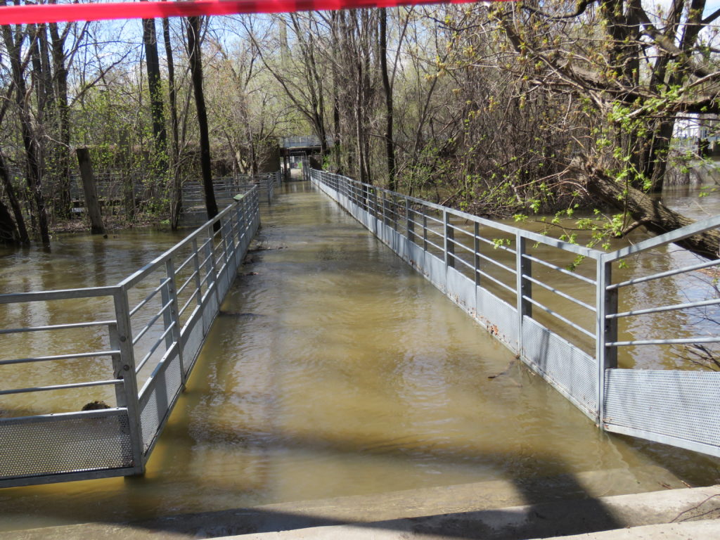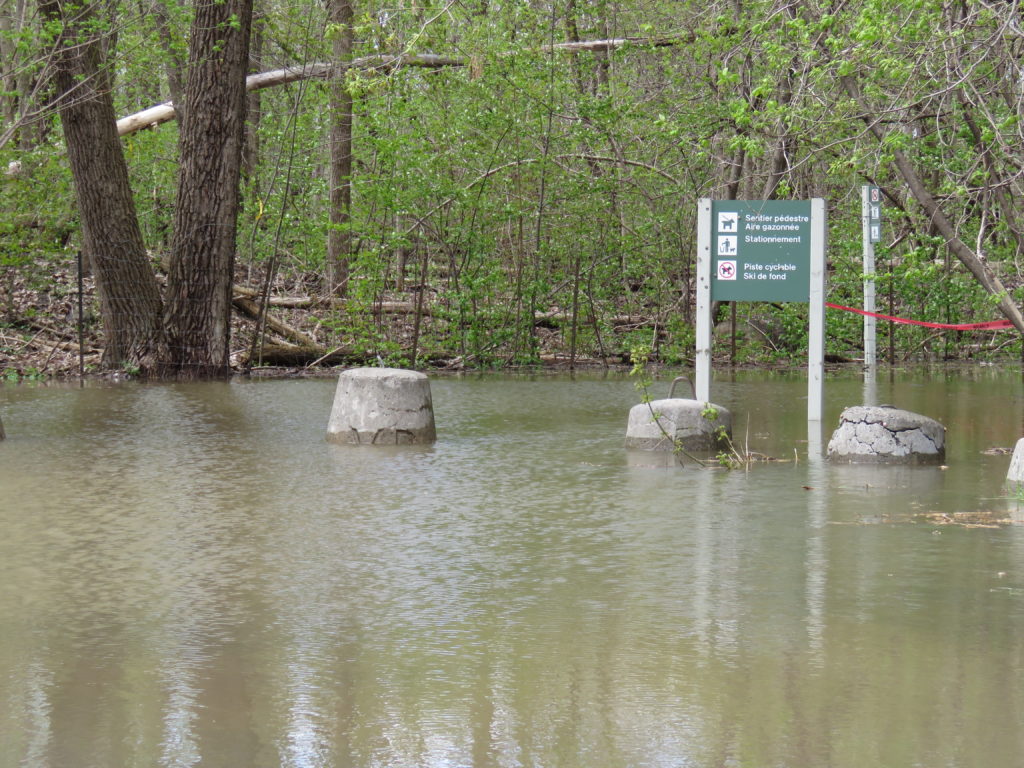 L’eau de la rivière des Prairies a envahi le parc-nature de l’Île-de-la-Visitation dans le Sault-au-Récollet en plusieurs endroits dans les sentiers, non loin des jardins communautaires, de la terrasse du Bistro, de la passerelle, et autres, comme en témoignent nos photos prises samedi dernier.