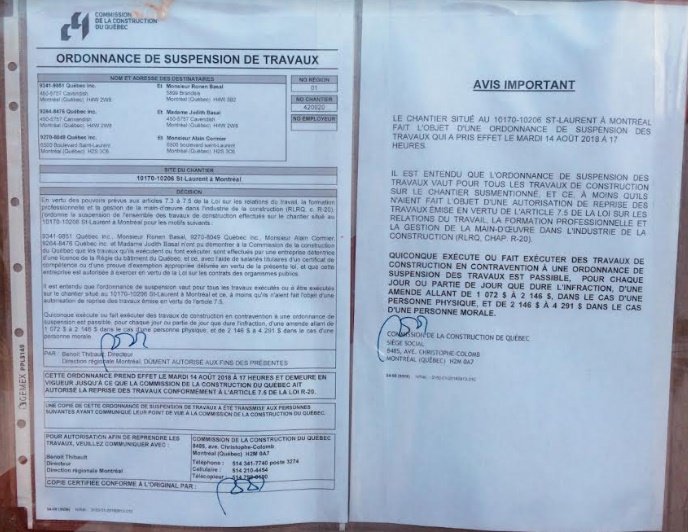 En se rendant sur le chantier en juillet dernier, journaldesvoisin.com a constaté que des affiches de la Commission de la Construction du Québec (CCQ) avaient été placardées sur une cloison et ordonnaient la suspension des travaux, suspension obtenue par mandat de la Cour supérieure du Québec.