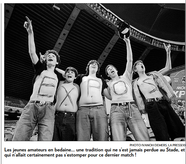 Le deuxième garçon en partant de la gauche est Nicolas Vocino, le fils de Pierre Vocino, au dernier match des Expos de Montréal. (Photo: parue dans La Presse le 30 septembre 2004, courtoisie Ivanoh Demers, archives La Presse)