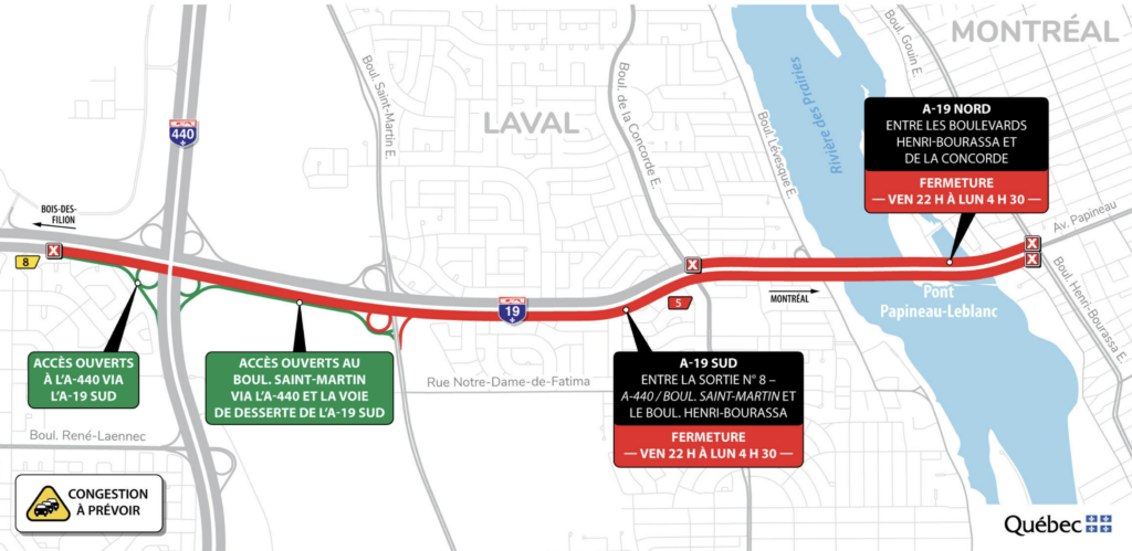 Transports Québec signale que le pont Papineau-Leblanc et une portion de l’autoroute 19 jusqu’à l’autoroute 440 seront fermés à la circulation dès ce soir (23 février, 22 h) jusqu’au lundi matin à 4 h 30.