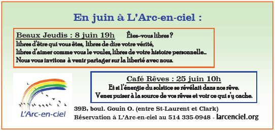 Nous joindre 39b, boul. Gouin Ouest Montréal (Québec) H3L 1H9 514 335-0948 Adresse URL : http://www.larcenciel.org