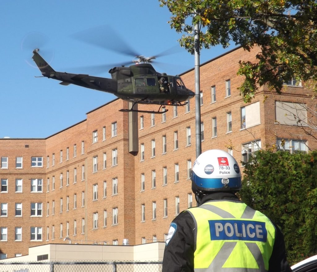 Hélicoptère atterrissant à l’héliport de l’hôpital Sacré-Coeur lors d’une simulation d’urgence en octobre 2014 (Photo : archives jdv)