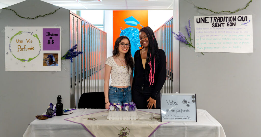 Angela Da Silva Carreira et Isabelle Ciauke-Bindile tiennent le kiosque Une vie parfumée à la foire entrepreneuriale de l’école secondaire Sophie-Barat le 3 juin 2023. (Photo: François Robert-Durand, JDV)