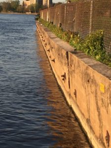 Ce long mur de béton, surtout immergé, que l’on peut voir entre l’arrière de l’école secondaire Sophie-Barat et le pont Papineau, jouxte entre autres quelques résidences privées, les CHSLD Berthiaume-du Tremblay et Laurendeau, un immeuble à logis multiples pour des jeunes, le terrain vendu par les Sœurs de la Miséricorde à un promoteur privé (mais qui fait l’objet d’une acquisition via  l’imposition d’une réserve foncière à des fins patrimoniales) et l’arrière de l’Église de la Visitation.