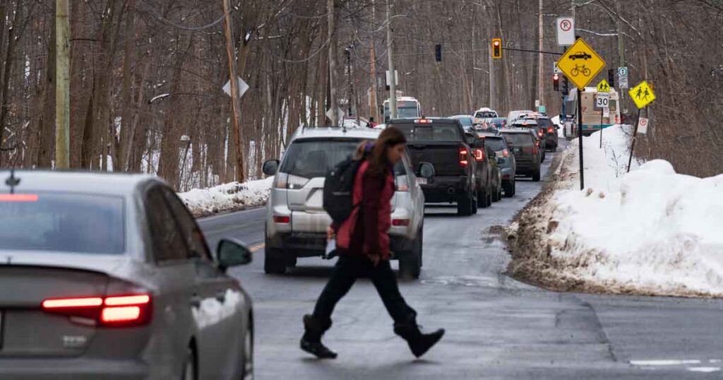Si c’est un environnement qui n’est pas du tout accueillant pour les piétons et les cyclistes, il ne l’est pas plus pour les automobilistes. En heure de pointe, les voitures se suivent collées les unes aux autres. La vitesse est limitée à 30km/h aux abords de l’école et à 40 au-delà. Cela pourrait être un peu trop rapide et insuffisamment prudent si un piéton, dans un cas de forces majeures, devait longer le boulevard Gouin Ouest sur l’asphalte déneigé.