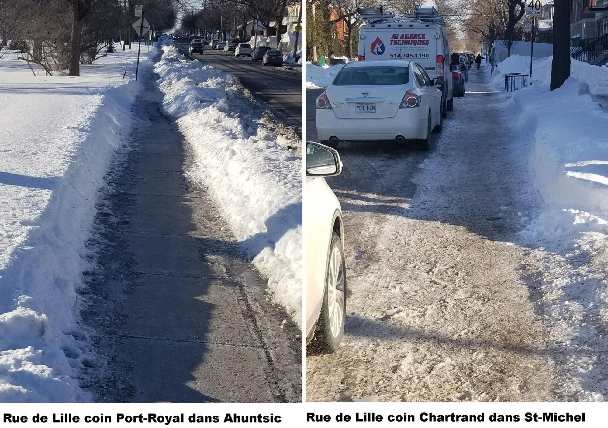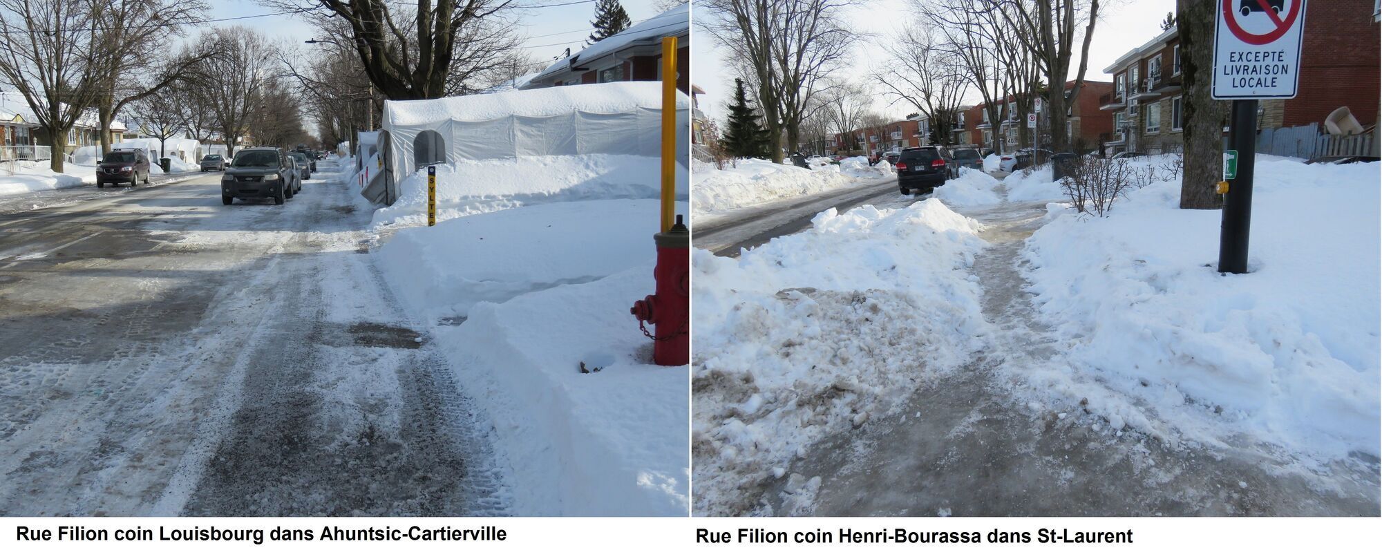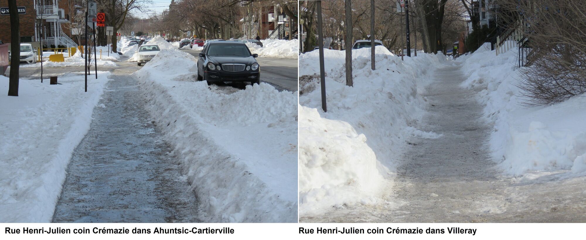 L’herbe est toujours plus verte chez le voisin, dit un dicton populaire. Journaldesvoisins.com a voulu savoir si «la neige était toujours mieux enlevée chez le voisin», ce que plusieurs riverains ont suggéré au cours sdes derniers jours, sur les réseaux sociaux, notamment, et par courriel au jdv. Par conséquent, lundi 18 février, nos photographes ont sillonné les arrondissements du nord et de l’ouest de l’île lundi, soit cinq jours après la tempête de mardi et mercredi précédents (12 et 13 février) pour les comparer avec Ahuntsic-Cartierville. Des visites ont été faites dans Villeray-St-Michel-Parc-Extension; Saint-Laurent; Montréal-Nord; et Pierrefonds. Leur constat: le déneigement est parfois mieux fait ailleurs; parfois moins bien fait; et en d’autres moments équivalent. Les résultats ne sont pas à trancher au couteau, selon eux.