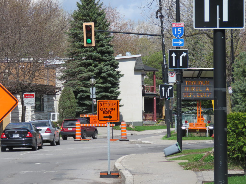 Le nouveau chemin de détour pour Gouin Ouest, à cause des travaux, passe désormais par le boulevard L’Acadie, sauf pour les autobus de la STM qui resteront sur Tanguay. Mais comme on peut le constater, certains automobilistes ne s’y résignent pas encore (à moins qu’il ne s’agisse de résidants…) (Photo: jdv P. Rachiele)