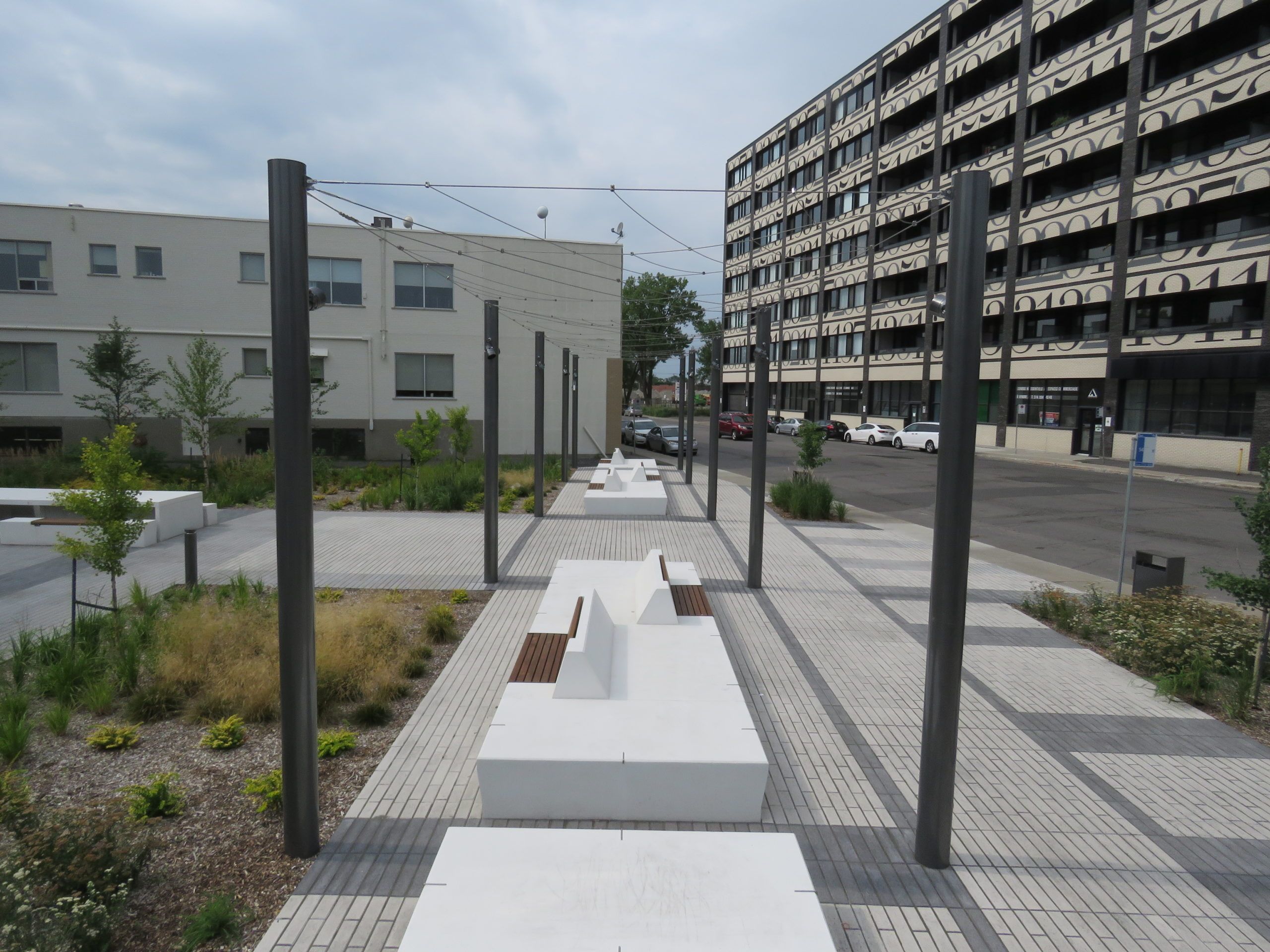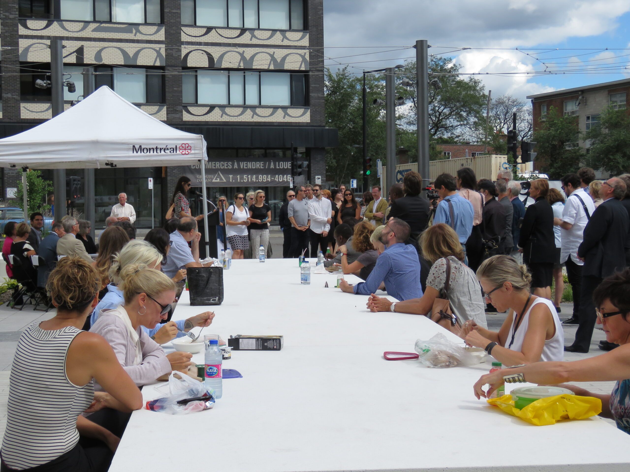 C’est sous un ciel quelque peu nuageux mais avec un chaud soleil de début septembre qu’a été inaugurée la nouvelle Place Iona-Monahan, angle de l’Esplanade et Chabanel, dans le quartier de la mode. En présence de dignitaires, dont le maire Pierre Gagnier et le conseiller du district de Saint-Sulpice et président du comité exécutif de Montréal, Pierre Desrochers, des élues Émilie Thuillier, Lorraine Pagé, et Mélanie Joly, et de la designer Marie Saint-Pierre, de membres de la famille de Mme Monahan, et des travailleurs du secteur qui y cassent la croûte le midi, que fut soulignée officiellement l’existence du nouveau lieu.