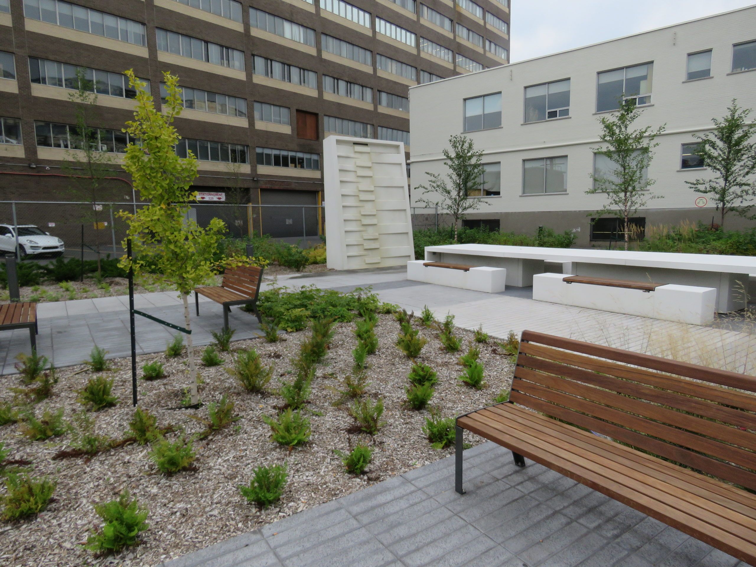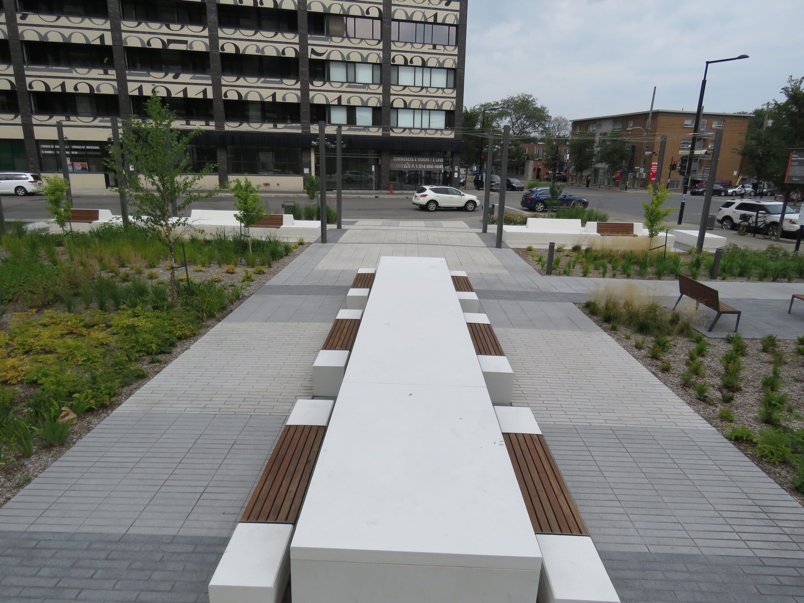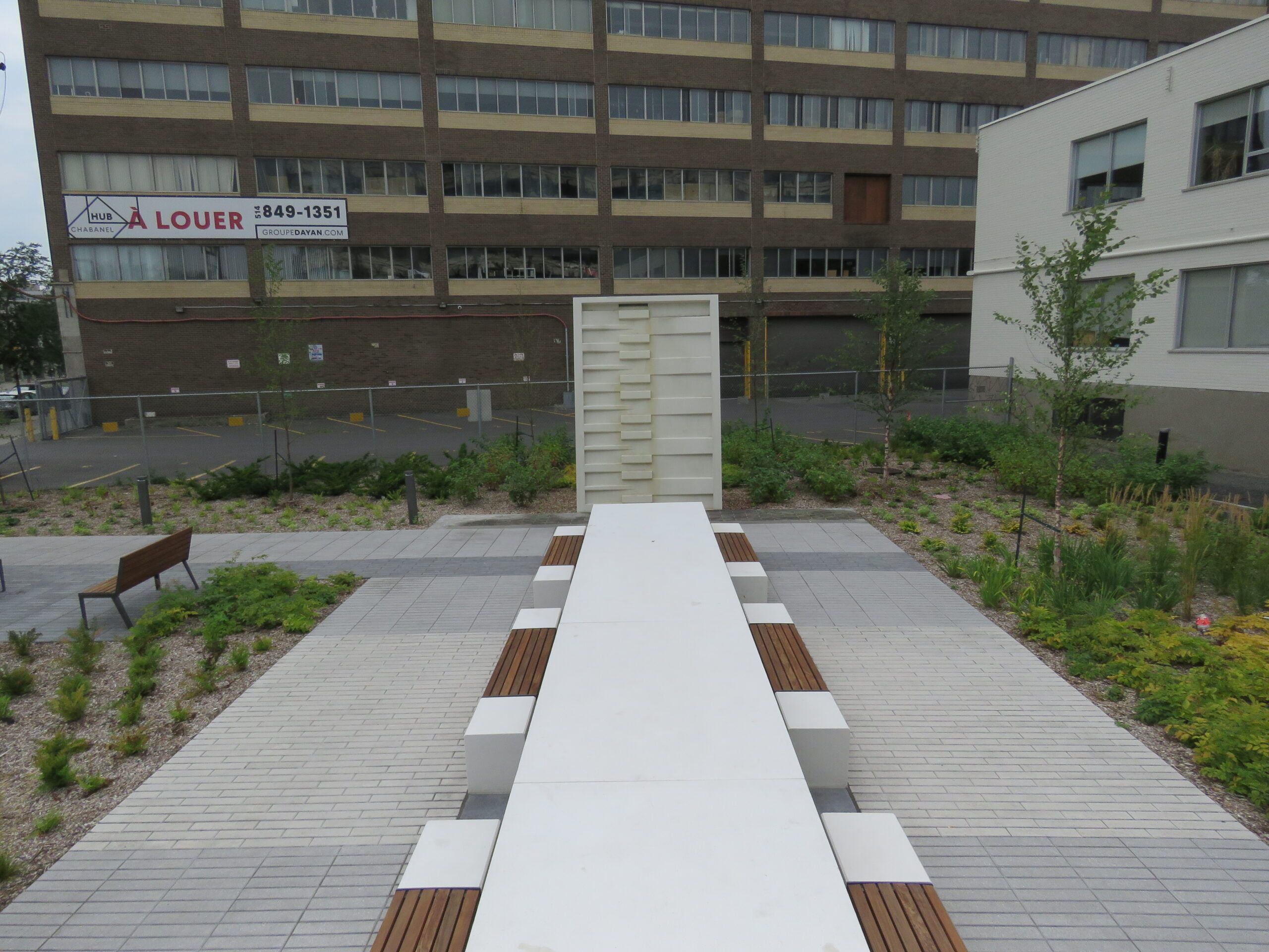 Parmi les éléments intéressants de la nouvelle Place Iona-Monahan, mentionnons une grande table à laquelle peuvent s’assoir les travailleurs qui viennent manger leur casse-croûte en grand nombre le midi. Selon le communiqué officiel de l’arrondissement, ce type de mobilier est inspiré des allées de défilés de mode et a été conçu expressément pour le lieu. En outre, une fontaine, structure perpendiculaire inusitée. fait jaillir de l’eau une fois par jour, pendant l’heure du lunch. Cette eau est récupérée pour arroser les nombreuses plantations qui ont été faites sur les lieux, a souligné le conseiller Desrochers.