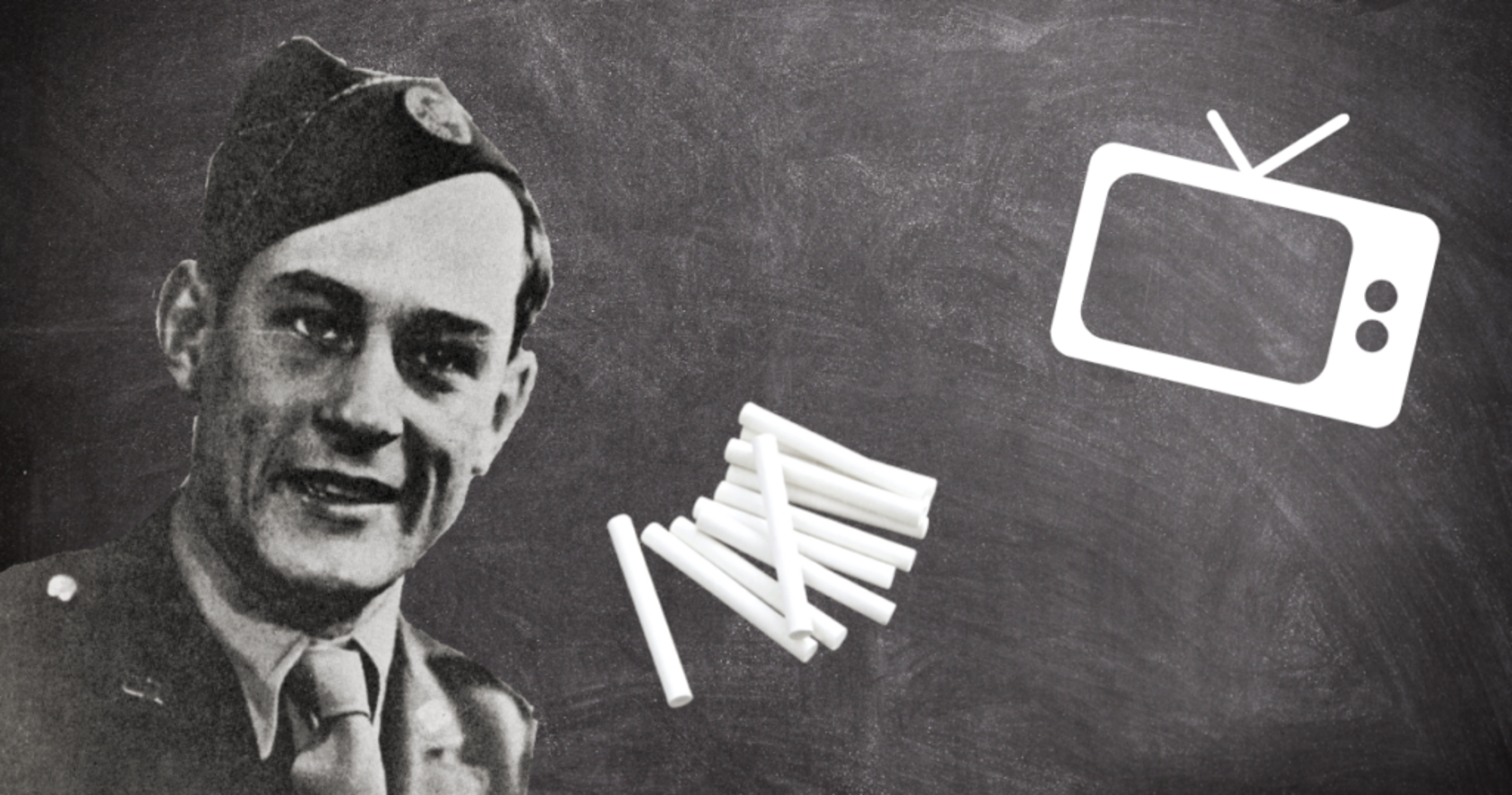 René Lévesque, alors qu’il était correspondant de guerre américain durant la Deuxième Guerre mondiale. On aperçoit en arrière-plan tableau noir et craies blanches, ces outils préférés outre la baguette et les cartes. De même, l’ancien écran de télé représente ce qu’il a utilisé pour informer les Québécois avec l’émission Point de mire, sur les ondes de Radio-Canada. (Création et montage: Samuel Lapierre)