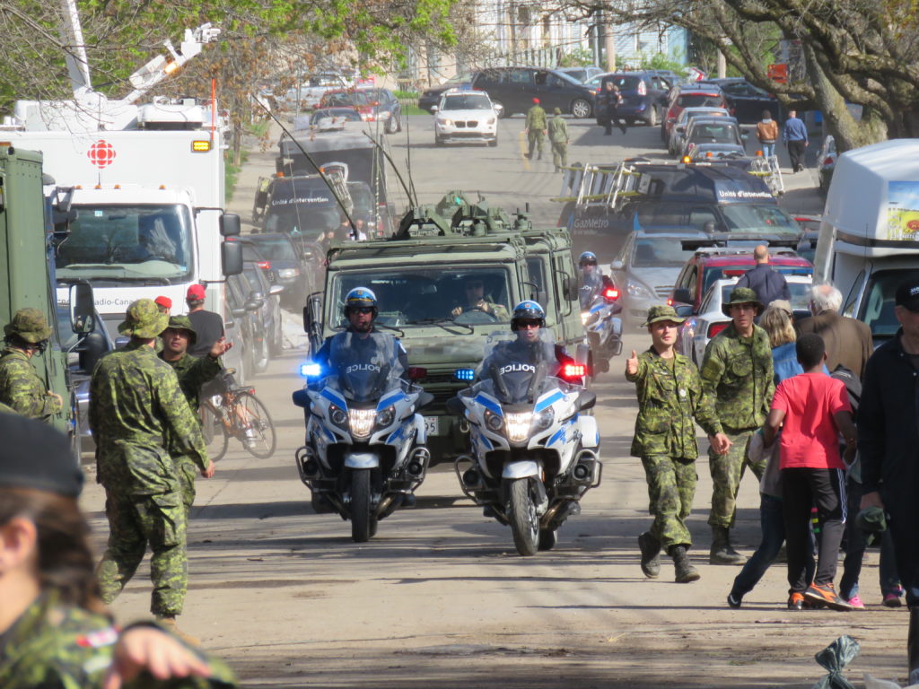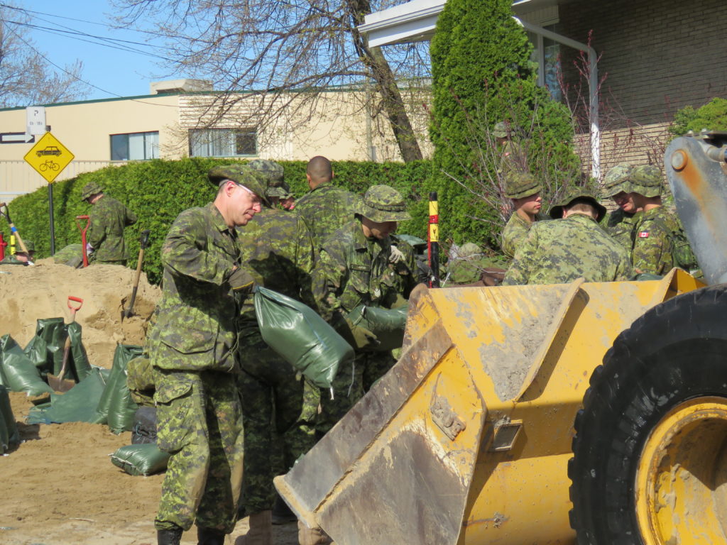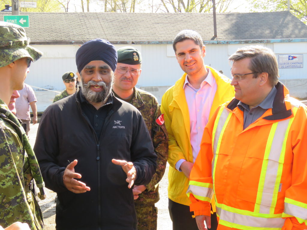 Alors que les militaires de l’Armée canadienne étaient toujours à pied d’oeuvre pour aider les résidants victimes des inondations, vendredi dernier, dans Cartierville, le ministre de la défense Harjit Sajjan est venu rencontrer ses troupes. Accompagné du brigadier-général H. Gosselin, commandement de la 2e Division du Canada et de la Force opérationnelle interarmées (Est), le ministre Sajjan a été accueilli par le conseiller de Bordeaux-Cartierville, Harout Chitilian, et le maire de Montréal Denis Coderre. Ces derniers étaient visiblement heureux de cette visite impromptue, mais aussi du fait que les inondations de la rue Cousineau étaient désormais sous contrôle. En effet, militaires et autres travailleurs avaient réussi à bloquer l’arrivée de l’eau de la rivière dans la rue Cousineau en ceinturant de digues le terrain du club de canotage de Cartierville.