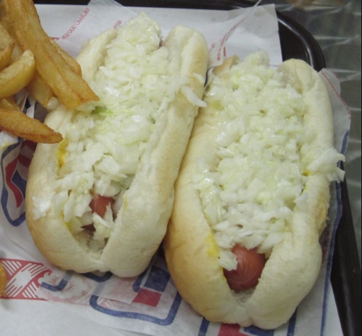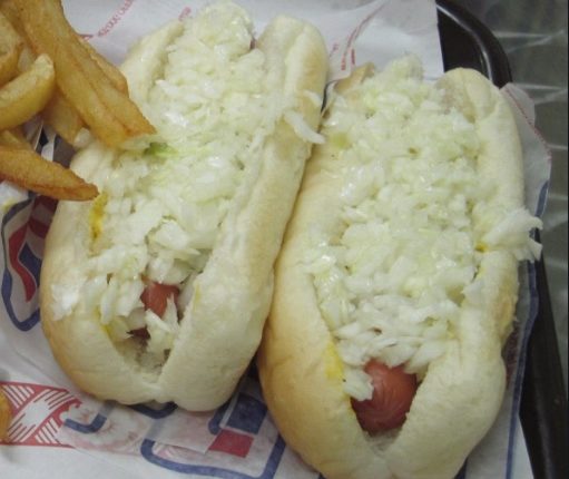 Sa main gauche agrippait le hot dog, sa main droite les frites. Des coulis de relish et de moutarde ruisselaient parfois sur son manteau de travail jaune orange. Pas grave! Il était déjà noir de poussière.