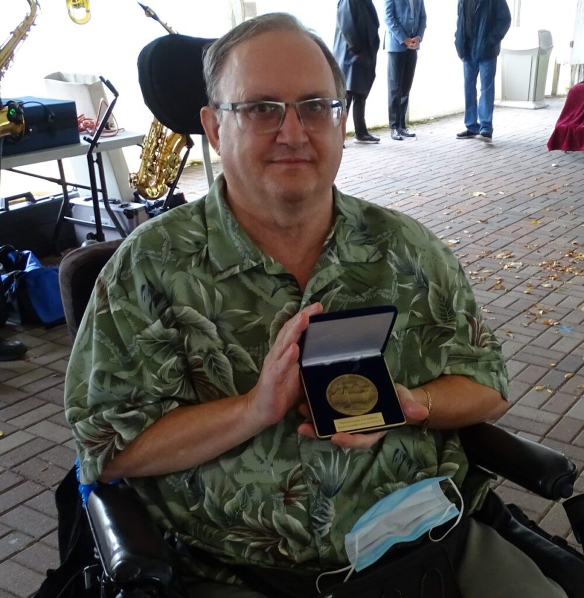 Robert Tremblay exhibe fièrement la médaille de l’Assemblée nationale qu’il vient de recevoir (Photo : jdv – Philippe Rachiele)